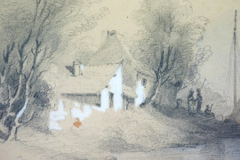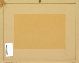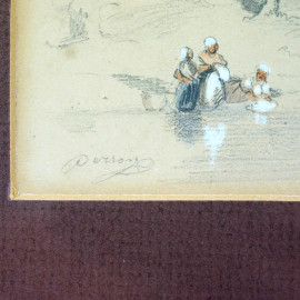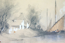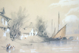 Paesaggio fluviale con figure e imbarcazioni, tecnica mista su carta, firmato, cm 12,5x19,5, entro cornice