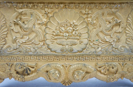Quadrante sormontato da figura di fanciulla distesa, quadrante a numeri romani, particolari cesellati a motivo di cesta con frutta, fiori e volatili, base lavorata a motivi geometrici, piedi a foggia di teste ferine alate e corpi zoomorfi, cm h 39x29x10, (difetti, meccanismo da revisionare).