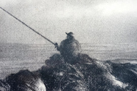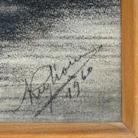 Pescatore sugli scogli, carboncino su carta, firmato e datato in basso a destra, cm 32,5x52, entro cornice