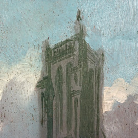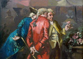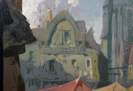Pittore del XX secolo, Gentiluomini al mercato dei fiori, olio su pannello, cm 48x24, entro cornice