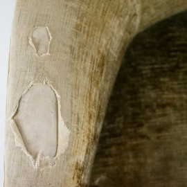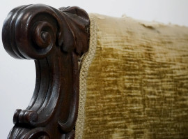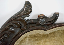 Poltrona Luigi Filippo in noce, XIX secolo, schienale e seduta imbottiti e rivestiti in velluto, braccioli nervati, gambe arcuate, cm h 109, (difetti, tappezzeria consunta)