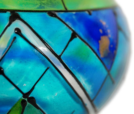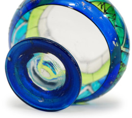 Potiche in vetro colorato nei toni del blu e del verde, firma sul coperchio, cm h 21, (lievi difetti)