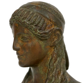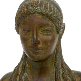 Scultura in bronzo brunito in stile archeologico rappresentante una Kore, XX secolo, altezza cm 30, base in marmo bianco