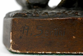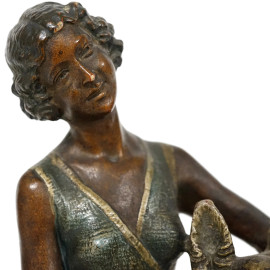 Scultura in gesso policroma rappresentante una donna con un pastore tedesco, firmata A. Santini, altezza cm 32(difetti)