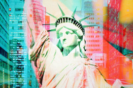 Statua della Libertà, stampa su tela, firmata in basso a sinistra D. Blechner, esemplare 2/8, reca timbro sul retro Eden Gallery, cm 79,8x79,8