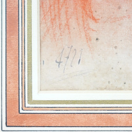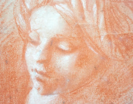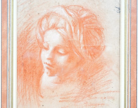 Studio di volto femminile, sanguigna su carta, XX secolo, siglato, timbro a tergo, cm 23,8x17,9, entro cornice