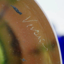 Vaso in vetro policromo a forma di calla con applicazioni floreali in paste vitree nei toni del blu, XX secolo, firmato a graffio Vivarini, altezza cm 56,5