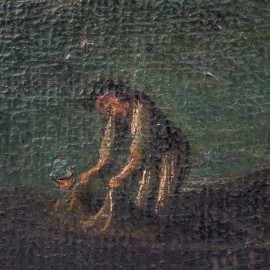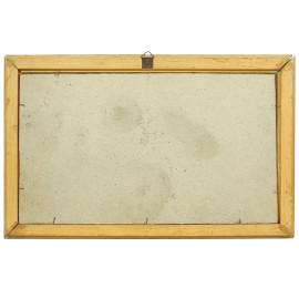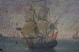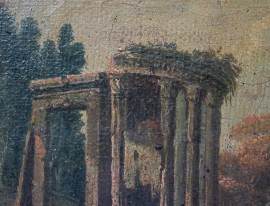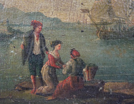 Veduta costiera con capriccio architettonico e figure, olio su tela riportata su cartone, cm 32,55x55,8, fine XIX secolo, entro cornice