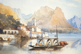 Veduta del Lago di Como, acquarello su carta, cm 21.5x36.5, fine XIX - inizi del XX secolo, entro cornice, (piccole macchie sulla carta)