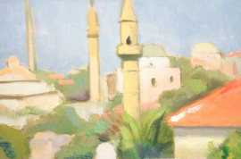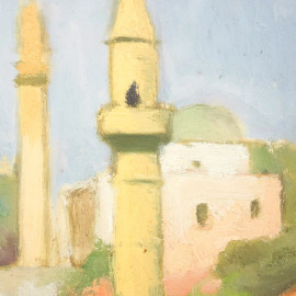 Veduta di città mediorientale, XX secolo, olio su tavoletta, cm 25,5x29,8, entro cornice