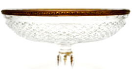 Alzatina in cristallo molato e controtagliato con bordi in bronzo dorato, poggiante su quattro piedini ferini, altezza cm 15, (difetti)