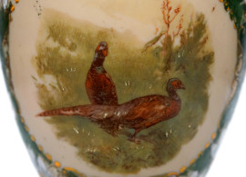 Base per lampada in opalina decorata in policromia a motivi vegetali e floreali con scena raffigurante faggiani, XX secolo, altezza cm 29,5, (difetti)