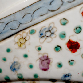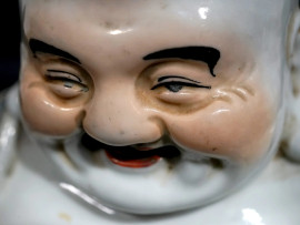 Buddha in porcellana policroma, Cina, XX secolo, cm 24,5x23x11,5, (difetti)