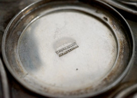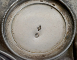 Calamaio in argento cesellato e sbalzato poggiante su quattro piedini ferini, XX secolo, cm 8,5x22,5x12, peso lordo gr 430, (difetti)