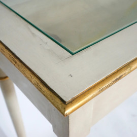 Consolle bacheca in legno laccato con rifiniture dorate, piano centrale in vetro, XX secolo, cm 101x150x50, (difetti)