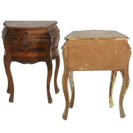 Coppia di comodini rispettivamente in legno laccato e impiallacciato in noce, con corpo intagliato, a due cassetti e gambe mosse, inizio XX secolo, cm 65x48x23,5, (difetti)
