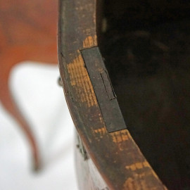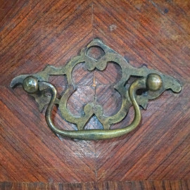 Coppia di eleganti comodini lastronati in bois de rose e bois de violette filettati ad intarsio, fronte bombato ad andamento concavo così come i fianchi, guarnito di due cassetti in colonna, gambe di linea centinata, maniglie e bocchette di bronzo.