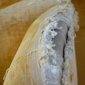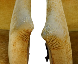 Coppia di poltrone con gambe mosse e imbottitura rivestita in tessuto senape, XX secolo, cm 84x82x69, (difetti, rotture)