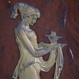 La credenza è guarnita di bronzi cesellati e dorati, prospetto a due sportelli delimitati da due colonnine lisce in legno ebanizzato sormontati da un finto cassetto, piano apribile celante vano scorrevole e specchio.