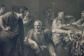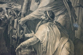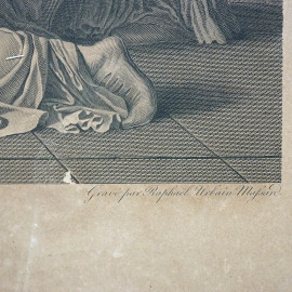 Incisione raffigurante Ippocrate che rifiuta i doni di Artaserse, cornice in legno e pastiglia dorata, XIX secolo, cm 60x82, entro cornice (difetti alla carta)
