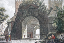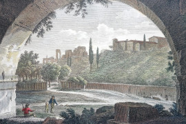 Lotto composto da 4 incisioni a colori raffiguranti monumenti di Roma, XIX secolo, cm 22,5x28,5, entro cornice, (difetti)