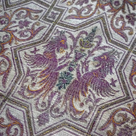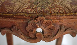 schienale sagomato con cartella a vaso, gambe anteriori mosse, raccordate alle posteriori da traversa ad H, sedute rivestite in tessuto con draghi, motivi geometrici e floreali, XVIII secolo, cm 102x51x43, (difetti)