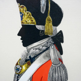 Lotto di cinque silhouette raffiguranti ufficiali in uniforme, acquerelli su carta ad assetto ovale, cm 17,5x11, XX secolo, firmate, entro cornici