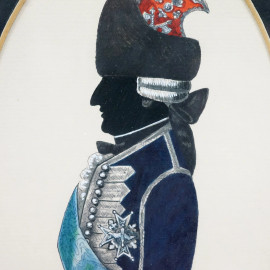 Lotto di cinque silhouettes raffiguranti ufficiali in uniforme, acquerelli su carta ad assetto ovale, cm 17,5x11, XX secolo, firmate, entro cornici