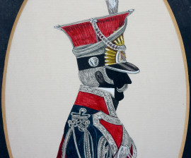 Lotto di otto silhouettes raffiguranti ufficiali in uniforme, acquerelli su carta ad assetto ovale, cm 17,5x11, XX secolo, firmate, entro cornici