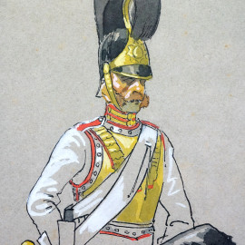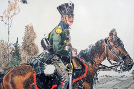 Lotto di quattro stampe acquerellate raffiguranti uomini in uniforme a cavallo, cm 33,5x25,5 compreso passepartout, XIX - XX secolo, entro cornici
