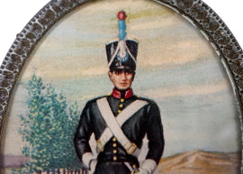 Lotto di quattro stampe di linea ovale raffiguranti soldati in uniforme, cm 11,5x8, XX secolo, entro cornici