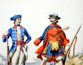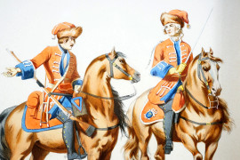 Lotto di quattro stampe rappresentanti soldati in uniforme, cm 42,27, XX secolo, entro cornici