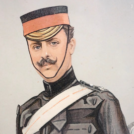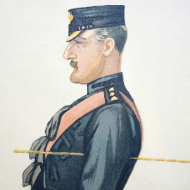 Lotto di sei stampe raffiguranti ufficiali celebri, "Vanity Fair", 1891-1900, cm 37x25, entro cornici