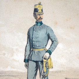 Lotto di tre stampe colorate raffiguranti militari in uniforme, cm 12x9,5, XX secolo, entro cornici