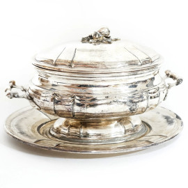 Lotto di una zuppiera ovale con coperchio, sottopiatto e due portavivande in metallo argentato, misura max cm 21x32x19