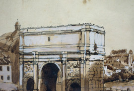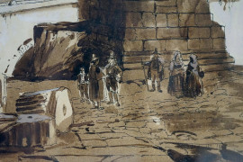Pittore del XIX secolo, Veduta del Foro Romano, tecnica mista su carta, cm 62x44,5, entro cornice