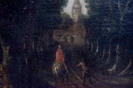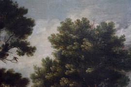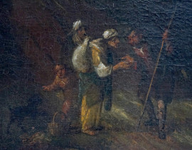 Pittore fiammingo del XVIII secolo, Paesaggio di campagna con figure, villa e sfondo di marina, olio su tela, cm 111x146, entro cornice (difetti)