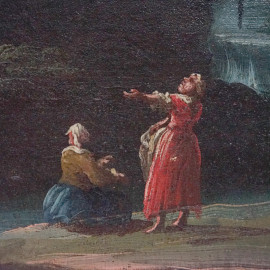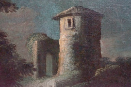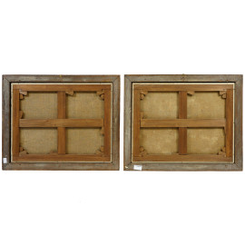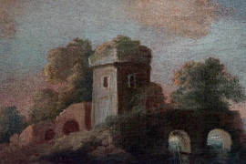 Pittore veneto del XVIII secolo, coppia di paesaggi fluviali con rovine e figure, cm 58x74, entro cornice