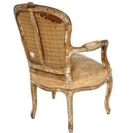 Poltroncina Luigi XV in legno laccato e intagliato, con rivestimento in tessuto damascato, cm 91,5x61x51, (difetti).