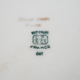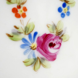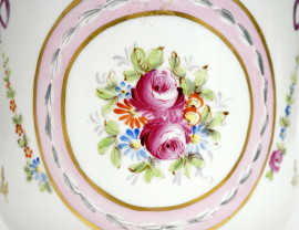Portavaso in porcellana dipinta a mano con decorazioni policrome a motivi floreali, vegetali e finiture dorate, Francia, XX secolo, cm 21,5, (difetti)