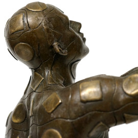 Scultura in bronzo raffigurante un uomo ricoperto di simboli geometrici, base quadrata in marmo nero, altezza cm 38
