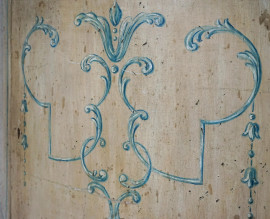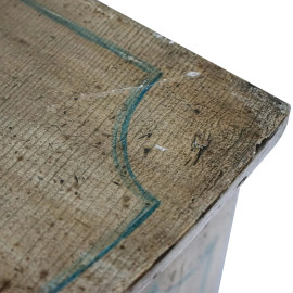 Servantina a mezzaluna in legno laccato e decori nei toni del blu, con fronte scandito da uno sportello con cassetto sovrastante, XIX-XX secolo, cm 88x80x39, (difetti, rotture)