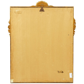 Specchiera di linea rettangolare in legno e pastiglia dorata con decori a fiori e conchiglia, cm 100x82 (difetti)