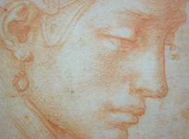 Stampa raffigurante volto di donna a sanguigna, cm 53,5x38,5, entro cornice (difetti)