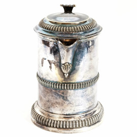 Tankard in metallo argentato con profili baccellati munito di beccuccio, altezza cm 20