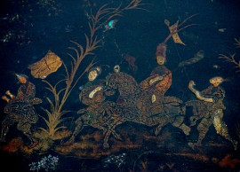 Tavolino da salotto in legno laccato nero, piano rettangolare dipinto in policromia e dorature a raffigurare un paesaggio con figure orientali, gambe arcuate, Cina, inizio XX secolo, cm 45x74x62, (difetti)