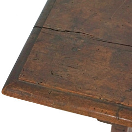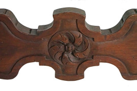 Tavolo da centro in noce, piano rettangolare sorretto da montanti intagliati e traforati a doppia voluta stilizzata, riuniti da traversa sagomata, piedi a mensola. Costruito con elementi antichi, cm 67x138x68, (difetti)