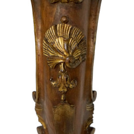 Tavolo in noce stile Luigi XV con piano rettangolare dal profilo centinato, fascia sottostante il piano, gambe di linea mossa intagliate a volute e motivi vegetali dorati, cm 73x157x71