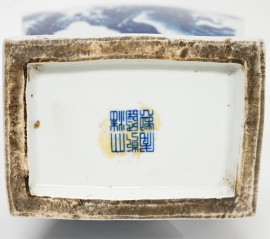 Vaso in porcellana bianca e blu, corpo di linea mossa a sezione rettangolare dipinto a paesaggi lacustri con costruzioni, ponticelli e figure, due anse modellate a drago, Cina, XX secolo, altezza cm 44
