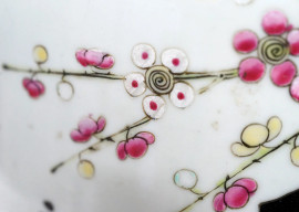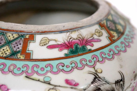 Vaso in porcellana decorata in policromia con vasi di bonsai, fiori e ideogrammi, Cina, XX secolo, altezza cm 40,5, (difetti)